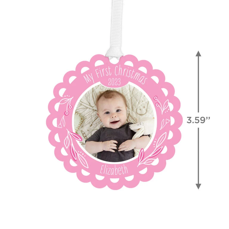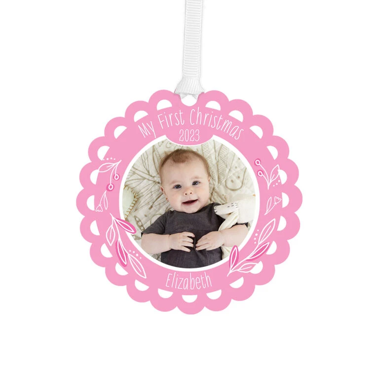 Celebrate baby’s first Christmas with this sweet personalized Christmas tree ornament. Choose a color for the round pierced metal decoration, then customize with a photo and year, name or a personal message. Commemorate this treasured milestone or give the ornament as a memorable gift to a special parent or grandparent you know.