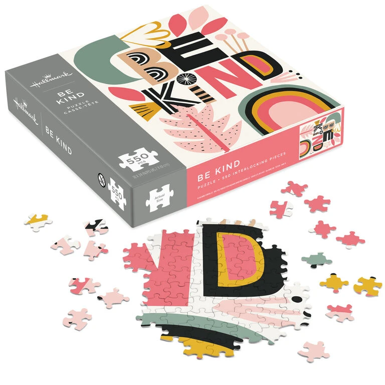 - Be Kind jigsaw puzzle includes 550 interlocking pieces in a sturdy storage box.