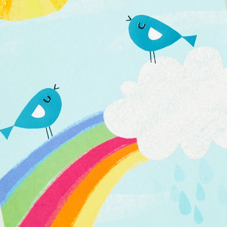 Birds on rainbow design: Just a little note…; Thinking of you and sending sunny thoughts.