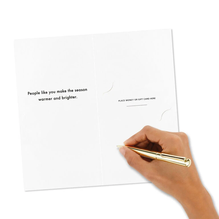 Boxed money-holder Christmas cards assortment features a variety of designs in festive holiday hues including multicolor lettering, Santa Claus, vintage ornaments, a snowman with cocoa and red stripe. Slots inside each card securely hold your gift of cash or a gift card. This bulk pack of money-holder holiday cards is perfect for tucking a gift inside a holiday hello for teens, family members, assistants and more.