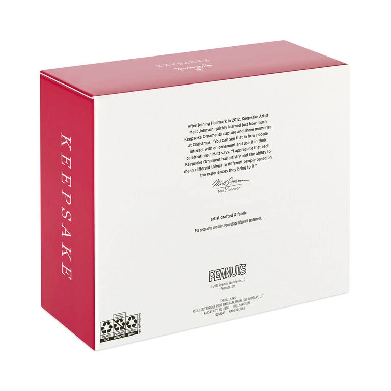 Join Peanuts pal Snoopy and get your tabletop tree ready for Santa’s arrival with this miniature Christmas tree skirt and tree topper set. Charlie Brown’s beloved beagle takes a rest after decorating his iconic red doghouse with a message of “Joy” in Christmas lights on the mini tree topper featuring a metal spring coil base. The coordinating red and green fabric mini tree skirt features a printed design of Snoopy in colorful stocking hats snoozing on light strings that spell “ho ho ho.”